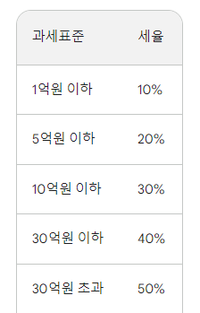 상속세 과세가액에 세율을 적용하여 산출한 세액을 상속세 산출세액으로 합니다. 상속세의 세율은 다음과 같습니다.