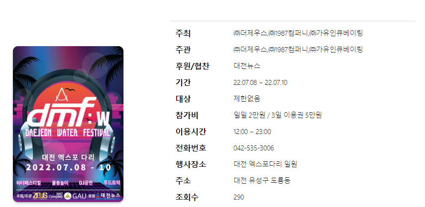 | 대전 시원한 여름 축제 - 대전 워터페스티벌 DMF (0) | 2022.06.27 |